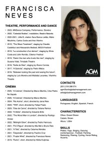 Trained in performing arts and cinema, her transdisciplinary practice focuses on the fields of dance, theater, and cinema. She studied at the Escola Superior de Teatro e Cinema, Balleteatro, ESMAE, ACT – Escola de Atores, TNDMII, and P.A.R.T.S., where she had the opportunity to learn and work with people and artists such as: Claudia Castellucci, John Romão, Beatriz Batarda, Sílvia Costa (Italy), Cathleen Mccarron (UK), Mathilde Monnier (France), Caroline Guiela Nguyen (France), Pierric Plathie, Ève-Marie Dalcourt (USA), Francesca Jaynes, and Dale Mercer. In 2019, she developed an interest in writing, taking classes with Ana Luísa Amaral, Pedro Mexia, and Sara Carinhas. More recently, she participated in the films A Colónia by Marco Martins, A Síbila by Eduardo Brito, Dias de Cama by Tatiana Ramos, and Midnight Glow by Pedro Harsnoury.