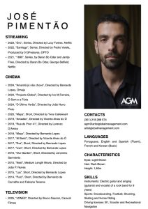 Actor and director, José Pimentão has established himself as one of the Portuguese actors with the strongest international projection. In cinema, he stood out in Al Berto, Eva and several award-winning shorts. On television, he appeared in Espias, Lugar 54, Valor da Vida, Teorias da Conspiraçãoand Filha da Lei. In 2022, he gained worldwide recognition playing Ramiro in 1899 (Netflix). In 2024, he returned with Eric, portraying Sebastian, a complex character set in 1980s New York. More recently, he appeared in 18 Buracos para o Paraíso, Amadeo and Histórias da Montanha. In parallel, he has developed work as director and screenwriter, with projects such as Três Tristes Tigres.