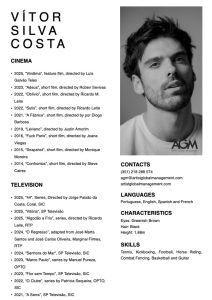 Born in Porto in 1992, Vítor Silva Costa studied at the Academia Contemporânea do Espetáculo and the Lisbon Theatre and Film School. On television, he has appeared in Vitória (SIC), Algodão a Frio (RTP), Senhora do Mar (SIC), Flor sem Tempo (SIC), O Clube (OPTO/SIC), A Serra (SIC), Conta-me Como Foi (RTP), Terra Brava (SIC), Alma e Coração (SIC), Espelho d’Água (SIC), A Impostora (TVI), Beijo do Escorpião (TVI), Sol de Inverno (SIC) and Morangos com Açúcar (TVI). In film, his credits include Vindima by Luís Galvão Teles, Adeus by Rúben Sevivas, Oblívio and Sulis by Ricardo Leite, A Fábrica by Diogo Barbosa, Leviano by Justin Amorim and Fde-te Paris* by Joana Viegas. On stage, he has worked with directors and companies such as Pedro Penim, Cleia Almeida, Joaquim Horta, SillySeason, Teatro Praga, Gonçalo Amorim and Daniel Gorjão, performing at venues including Teatro Nacional D. Maria II, Teatro Aberto and CCB. He has trained with Lucy Lenox, David Bonneville, Marcia Haufrecht and Lenard Petit (Michael Chekhov Studio, NYC).